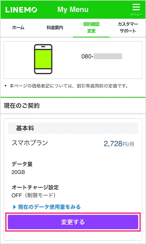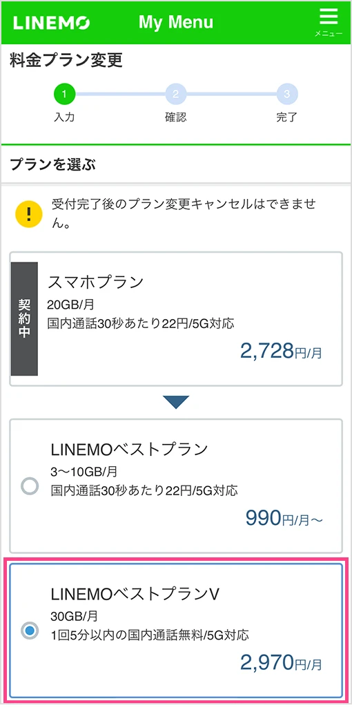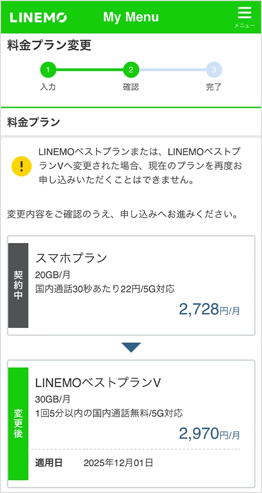 LINEMOベストプランVに変更で、