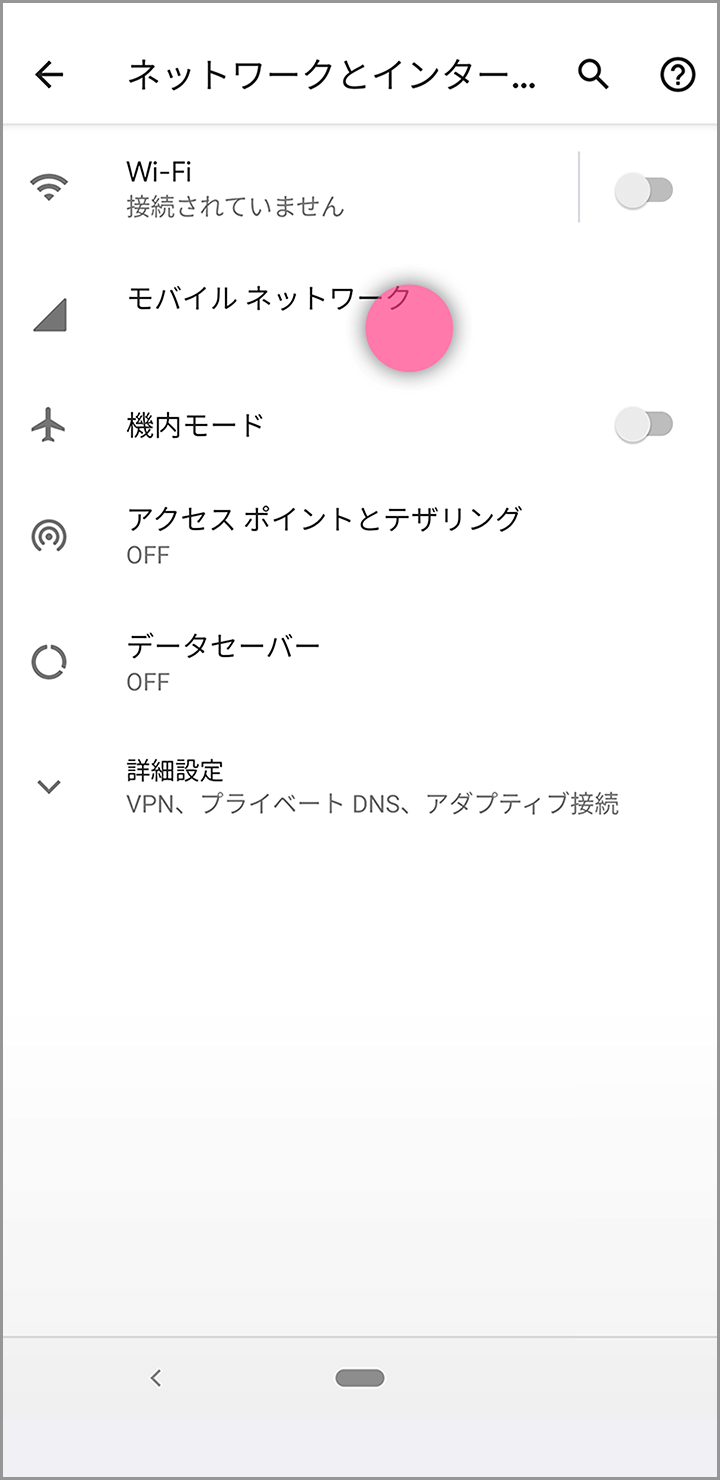 Wi-Fiをオフにし、設定の「ネットワークとインターネット」から「モバイルネットワーク」を選択してください。
