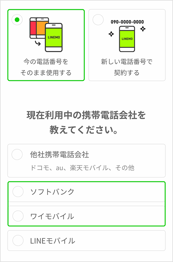 ソフトバンク回線を利用したMVNO回線(LINEモバイル含む)をご利用中のお客さまは「他社からのりかえ」をご参照ください。