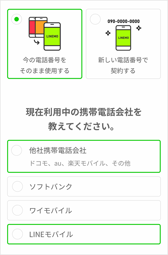 申込画面で「今の番号をそのまま利用する」→「他社携帯電話会社」もしくは「LINEモバイル」を選択し、のりかえ情報画面でMNP予約番号を入力してください。